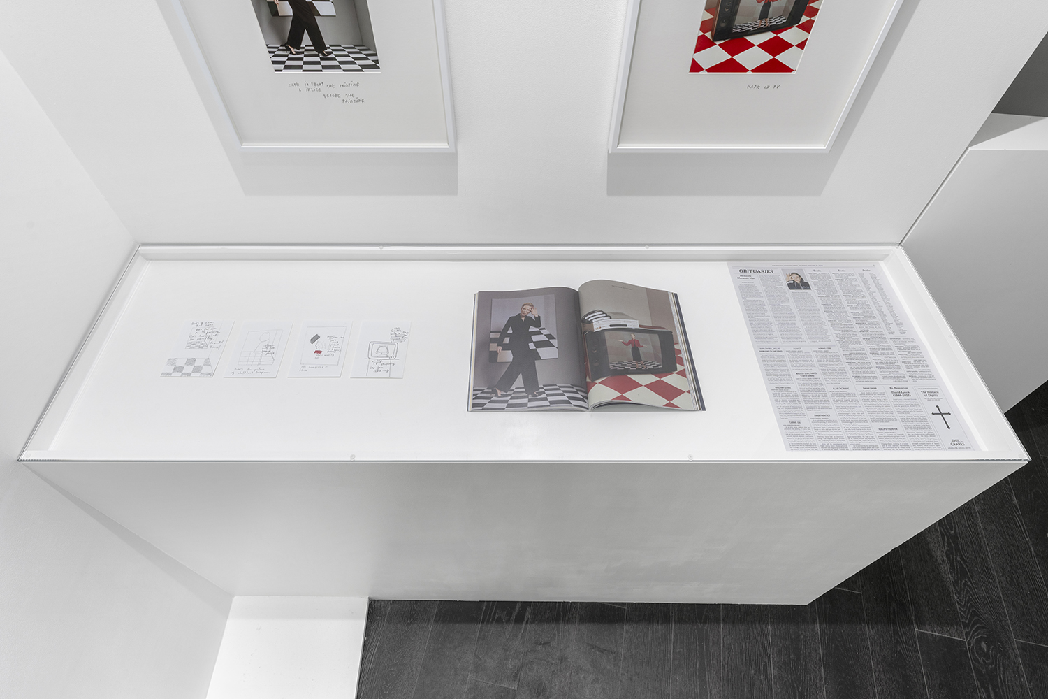 At its initial stage, this painting even appears in the background of another photograph featuring Cate Blanchett—a collision between personal practice and commissioned work that is further reinforced by a third photograph in which the actress appears on screen like Alf in the painting. Coco Capitán completed the painting after the session with Cate Blanchett. Displayed in the window are the preparatory sketches for this shoot, the final publication, and the obituaries page of The Present Morning Times.