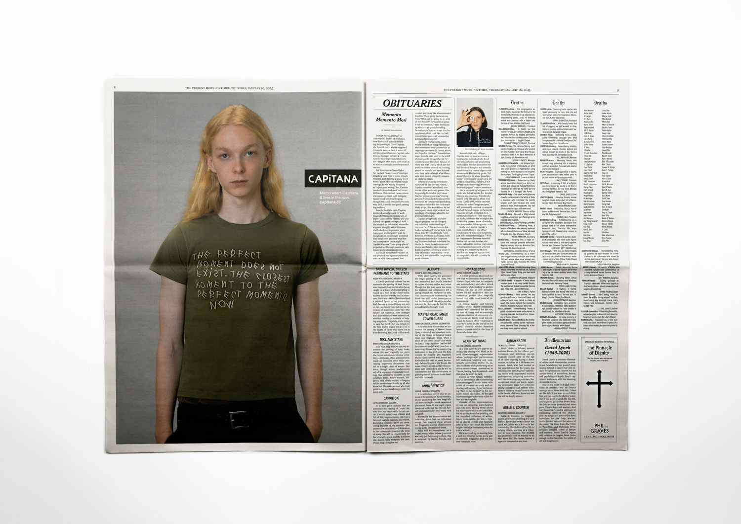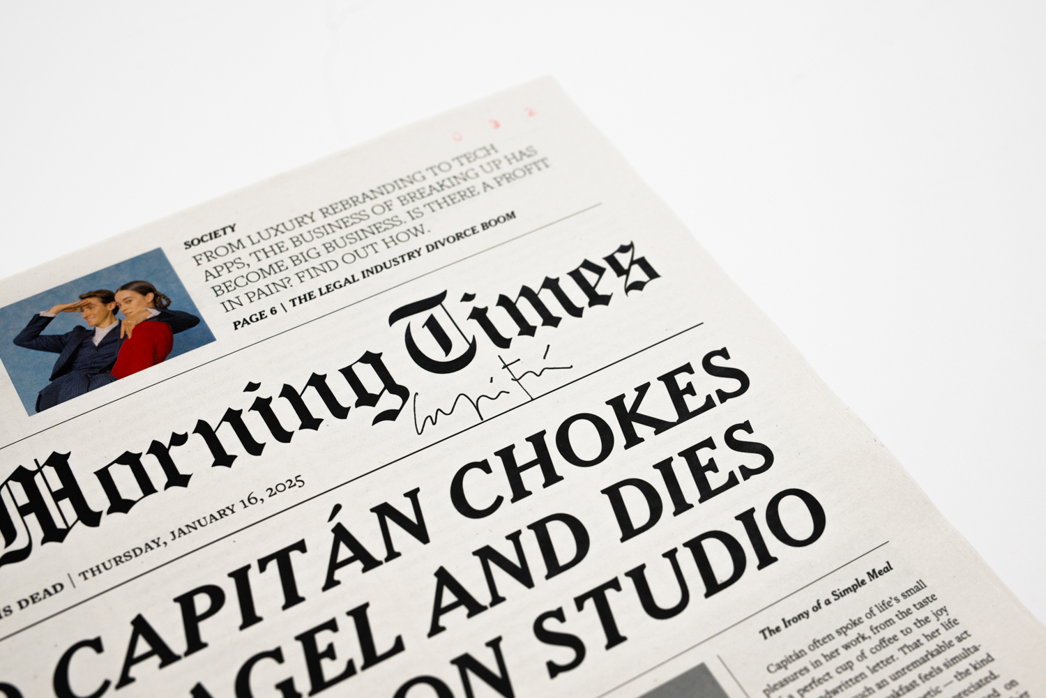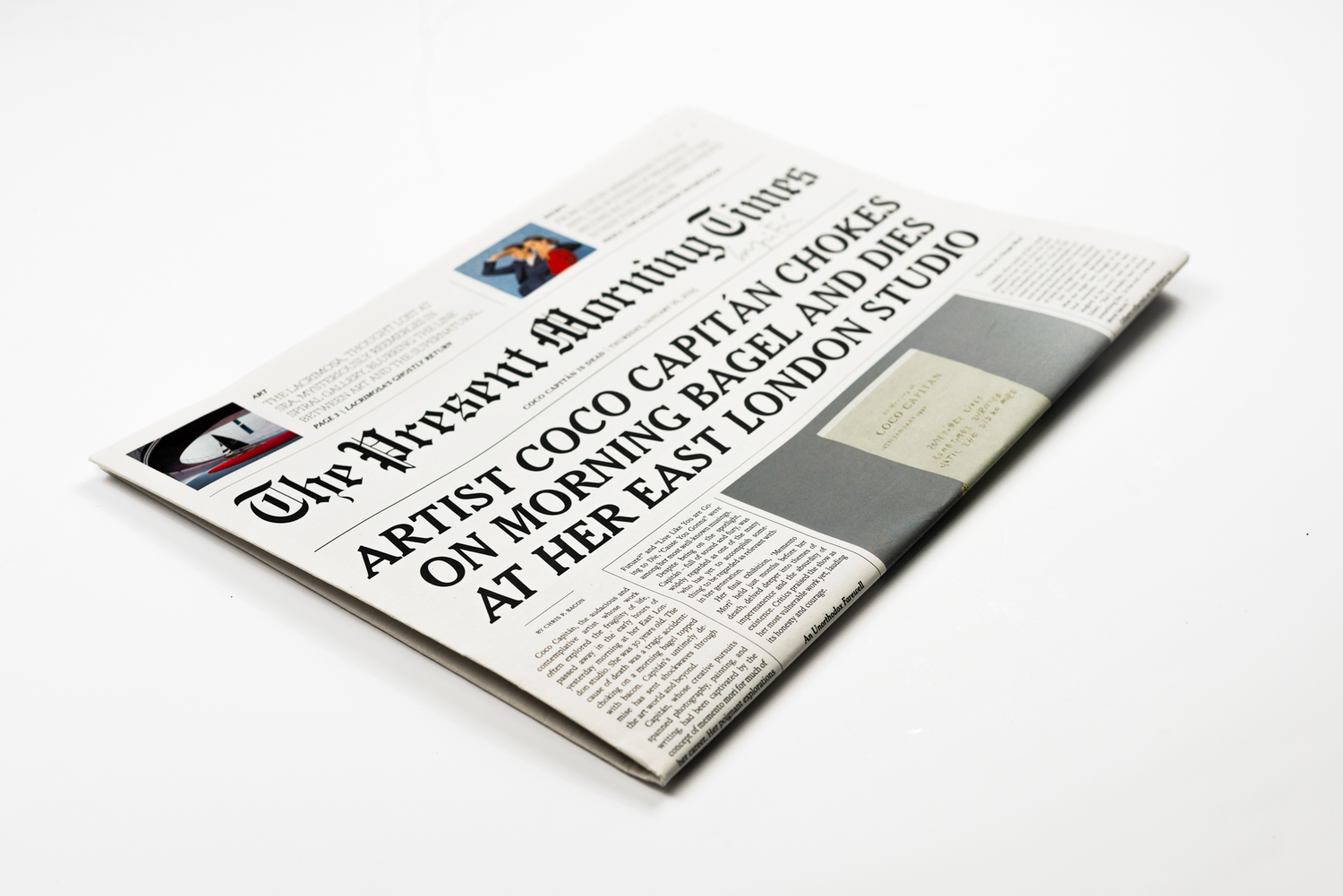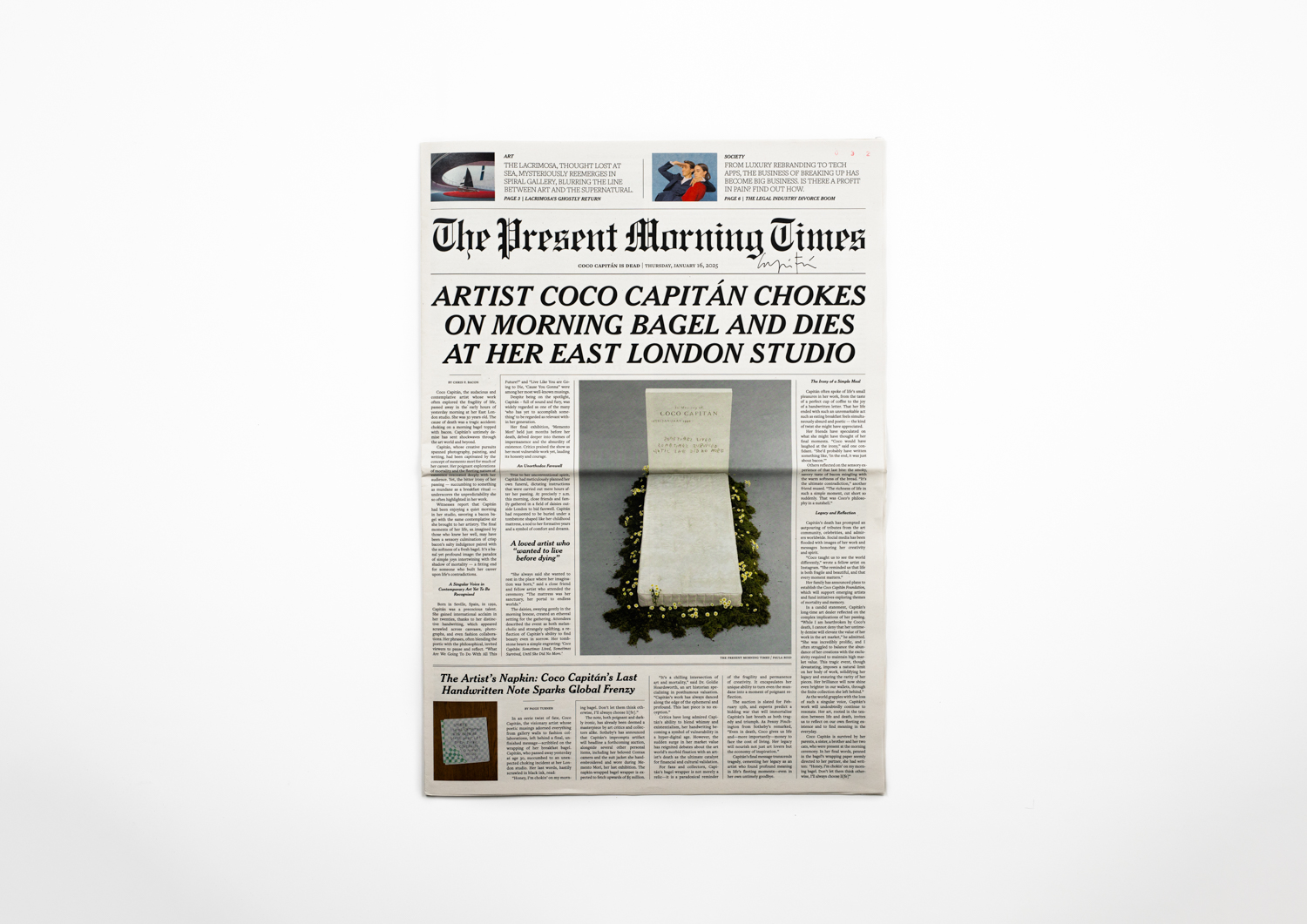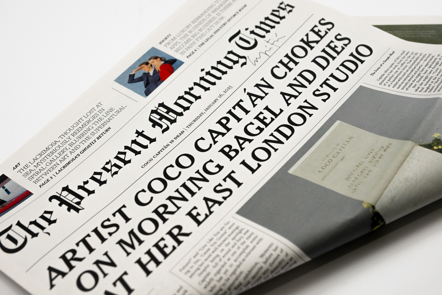 In 2023, Coco Capitán announced her own death on the front page of a newspaper read by an incredulous female character (The Present Morning Times: Bath Time Drama—the text is inspired by Mark Rothko’s obituary in The New York Times in 1970). In 2025, this edition of The Present Morning Times took shape as a self-published artist’s book which, while reporting the sad news on its cover, overflows with humour through its wordplay, aphorisms, and whimsical editorials, deploying all the codes of the press, from the crossword puzzle to the expected obituary, not to mention advertisements—here for Capitana, the brand launched in real life by the artist.