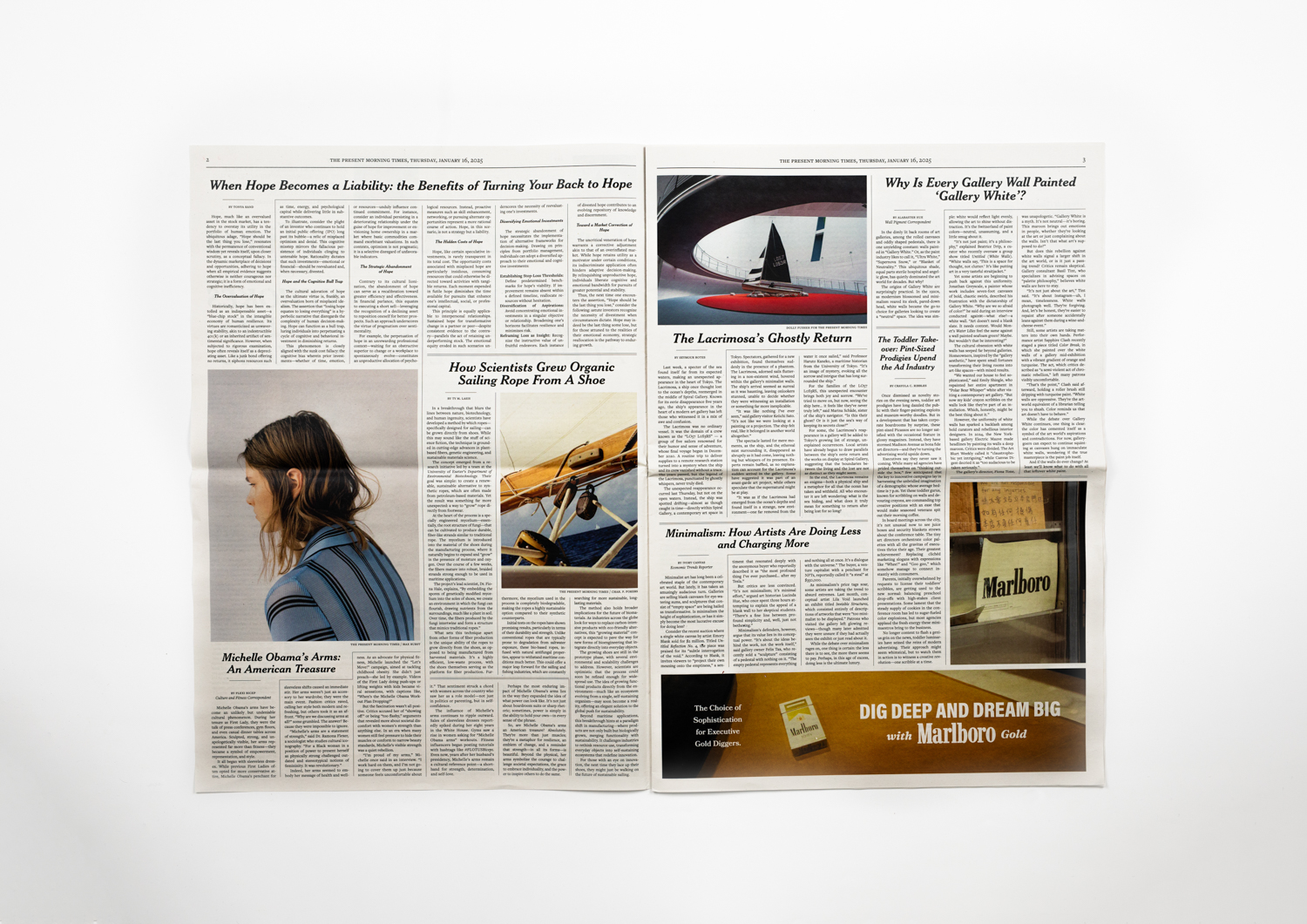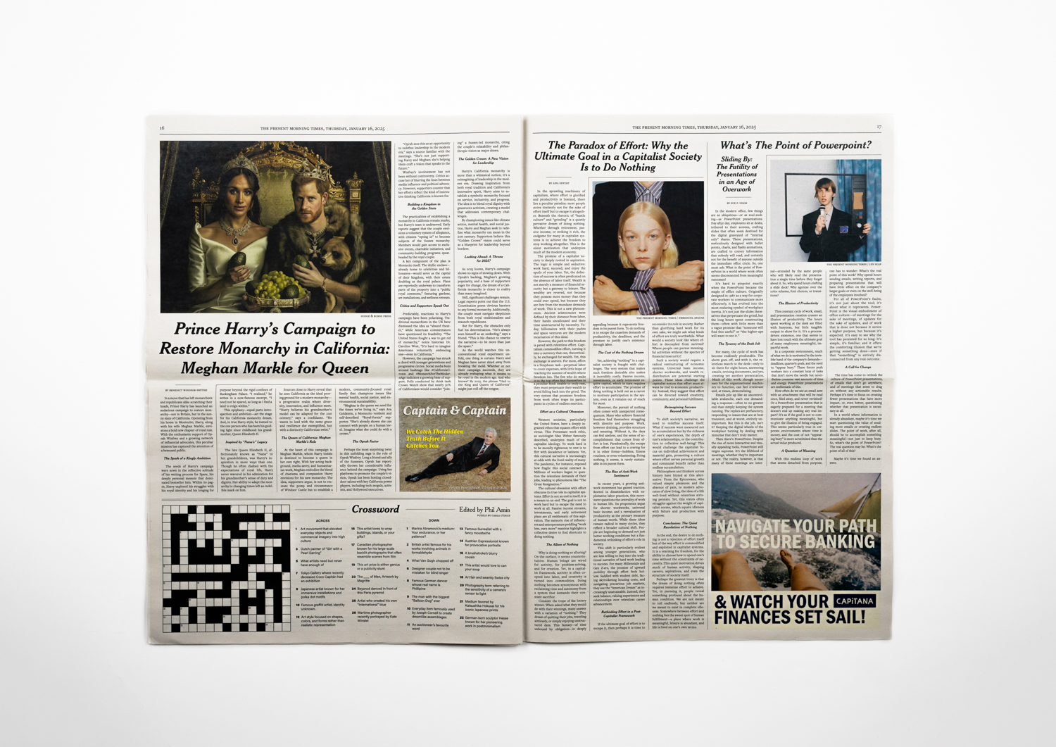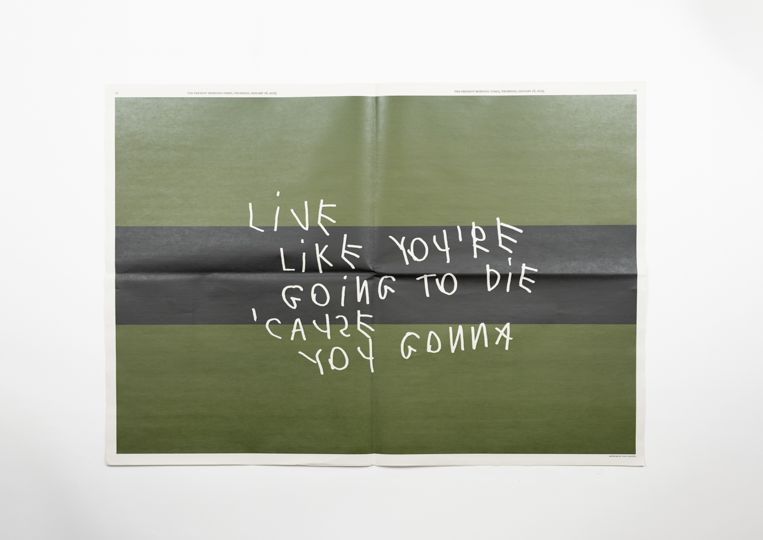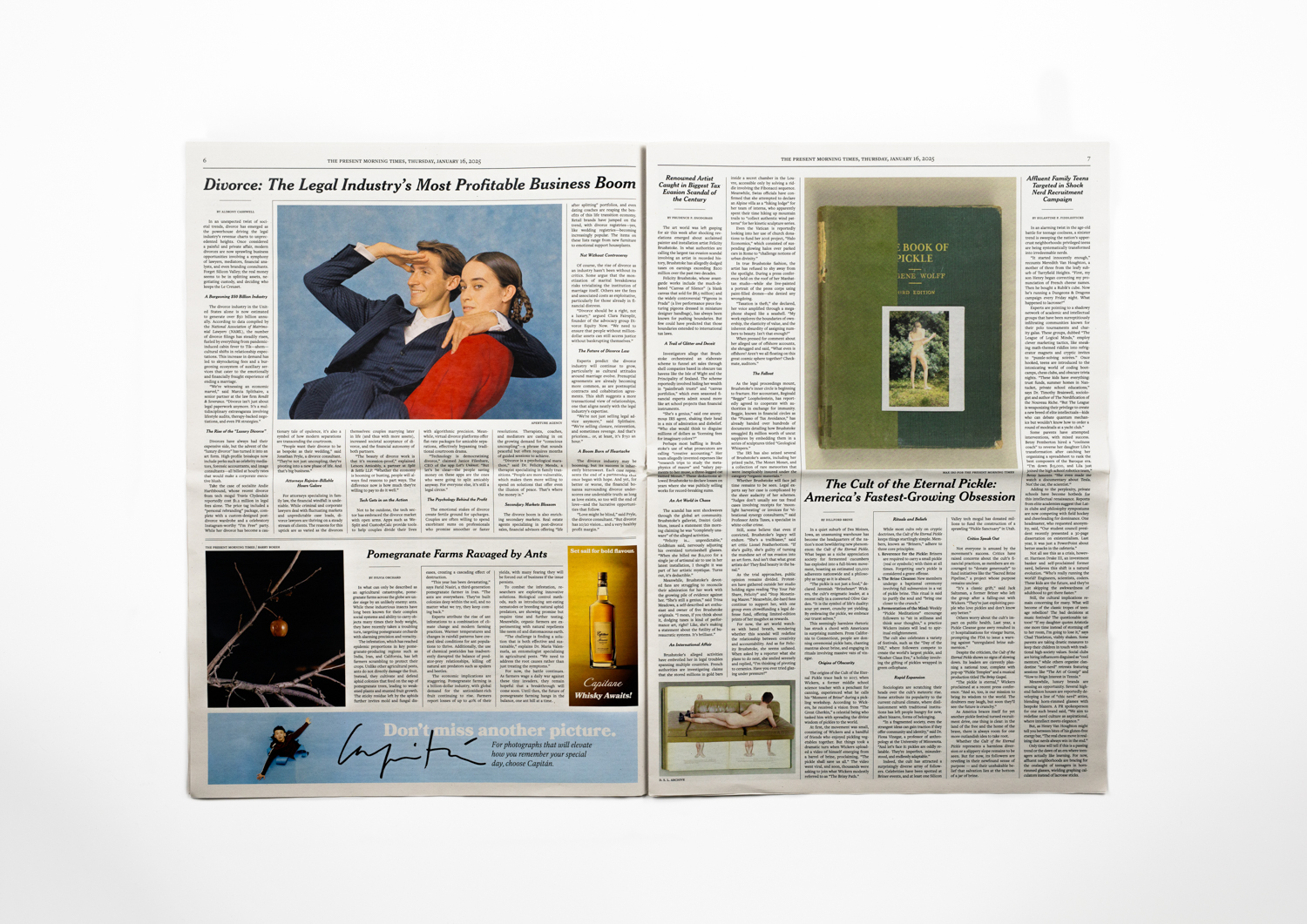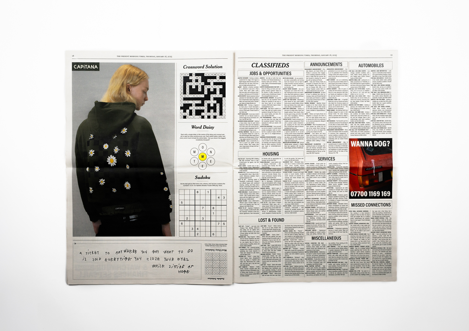 In 2023, Coco Capitán announced her own death on the front page of a newspaper read by an incredulous female character (The Present Morning Times: Bath Time Drama—the text is inspired by Mark Rothko’s obituary in The New York Times in 1970). In 2025, this edition of The Present Morning Times took shape as a self-published artist’s book which, while reporting the sad news on its cover, overflows with humour through its wordplay, aphorisms, and whimsical editorials, deploying all the codes of the press, from the crossword puzzle to the expected obituary, not to mention advertisements—here for Capitana, the brand launched in real life by the artist.