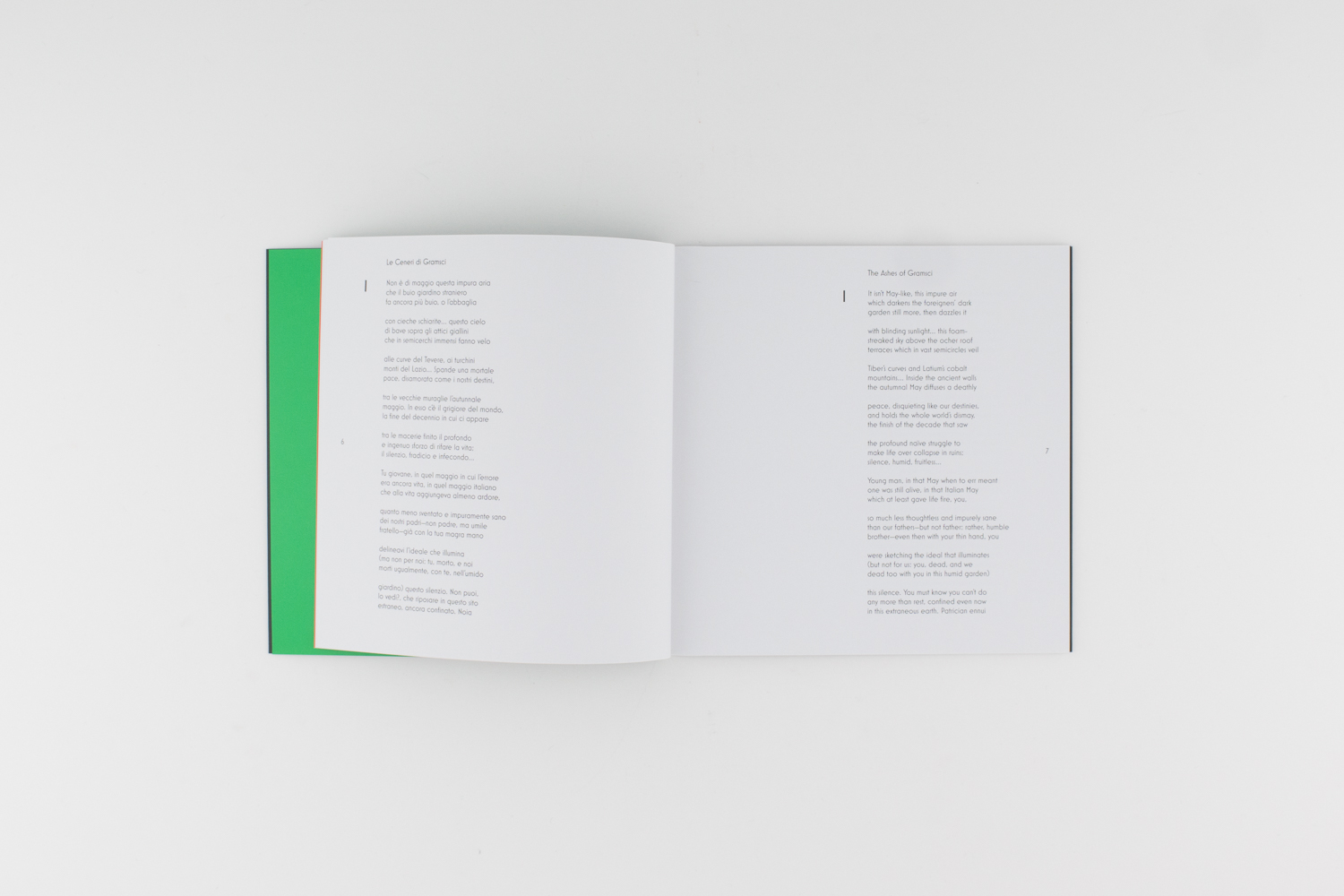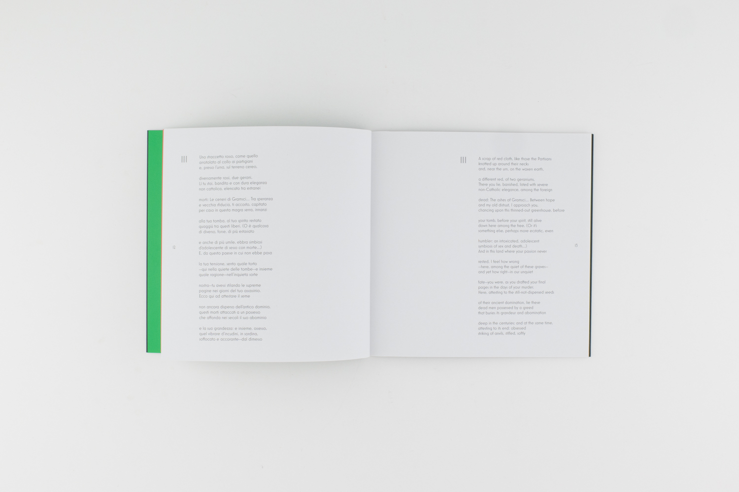 Publié en hommage à Pier Paolo Pasolini, ce livre d'artiste d'Alfredo Jaar reprend le poème imaginé en 1954 par le cinéaste italien alors qu'il se rendait sur la tombe du révolutionnaire marxiste italien Antonio Gramsci. Dans ce poème, Pasolini médite sur la vie devant la tombe de Gramsci, évoquant des thèmes tels que la politique, la poésie, la sexualité et l'Italie.